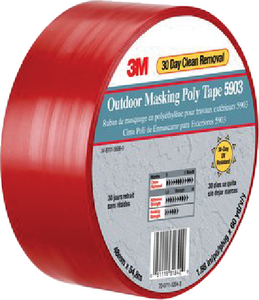 Outdoor Masking Poly Tape 5903 is a poly tape comprised of heavy duty polyethylene film and synthetic rubber adhesive. Removes cleanly for up to one month with little or no adhesive residue on most opaque surfaces without deteriorating or fading. Conformable backing. Easy to tear by hand.