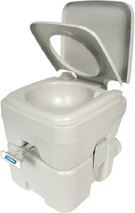 Portable toilets are compact and lightweight. Holding tanks are detachable for easy emptying. Features a leak-proof design with locking lid to prevent spills. Sealing slide valve allows easy flushing and locks in odors. Sturdy construction with durable parts and seals.