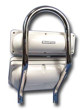 Double Bend AngleGuard 9.5″ Wide by 1.25″ diameter for one InstrumentPod and a P1050/GP1800/GP1200/GP1900 SailPod below on the angled section. Both Single and Double Bend AngleGuards are available in 1” or 1.25” diameter stainless steel tubes.