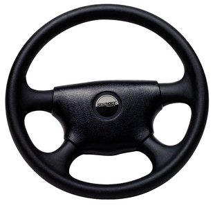Black four-spoke steering wheel. Rim features rich leather grain, stitching and finger grips.
